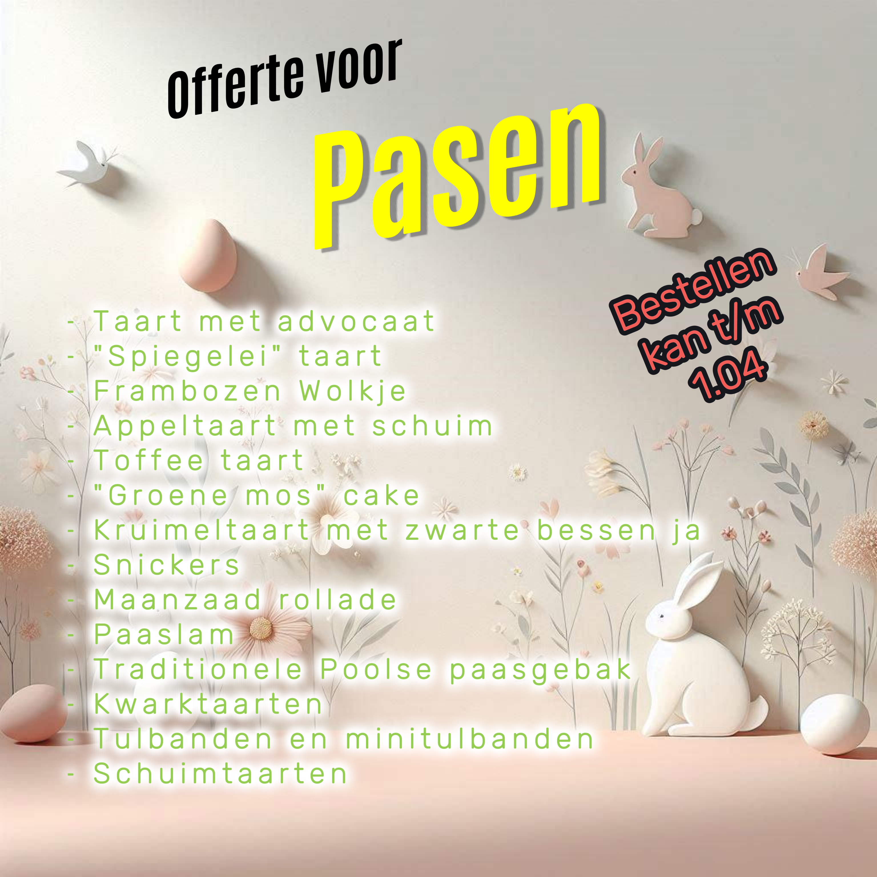 Wij nodigen jullie van harte uit om te bestellen en wensen jullie alvast een zoet en vrolijk Pasen! π·π°